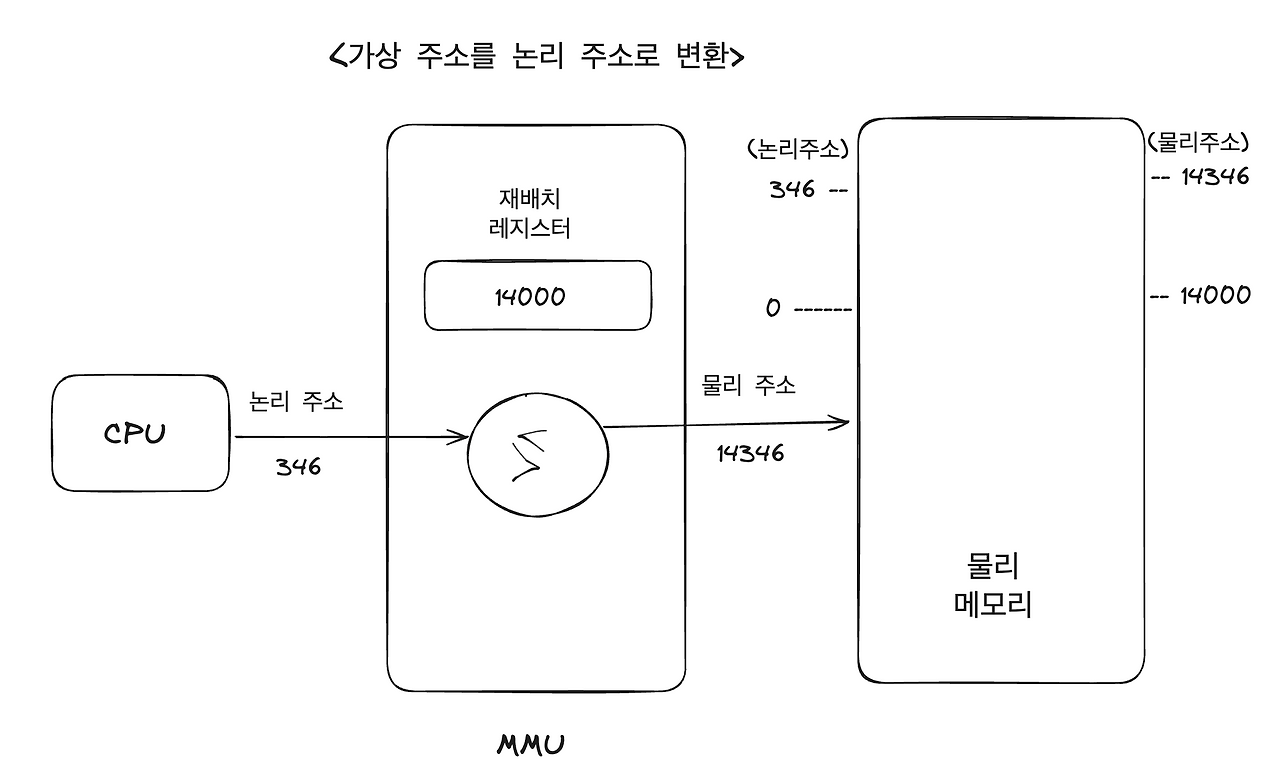 - 재배치 레지스터 값이 14000 일 때, 프로세스가 346 번지에 엑세스한다면 → 사실은 14346 번지에 엑세스 하는 것.