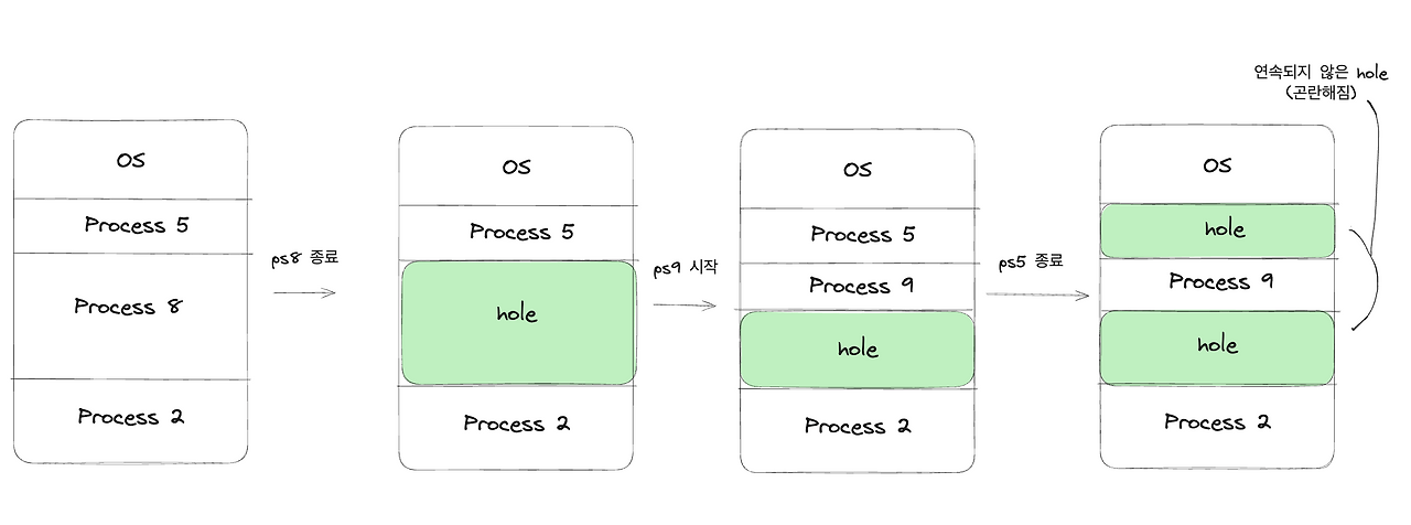 - 이처럼 두개의 연속되지 않은 hole 이 생기면, ps5 와 똑같은 양의 메모리를 차지한 ps9 이 있더라도 hole 이 두개로 나뉘어있어 제대로 적재하기 힘든 사태가…